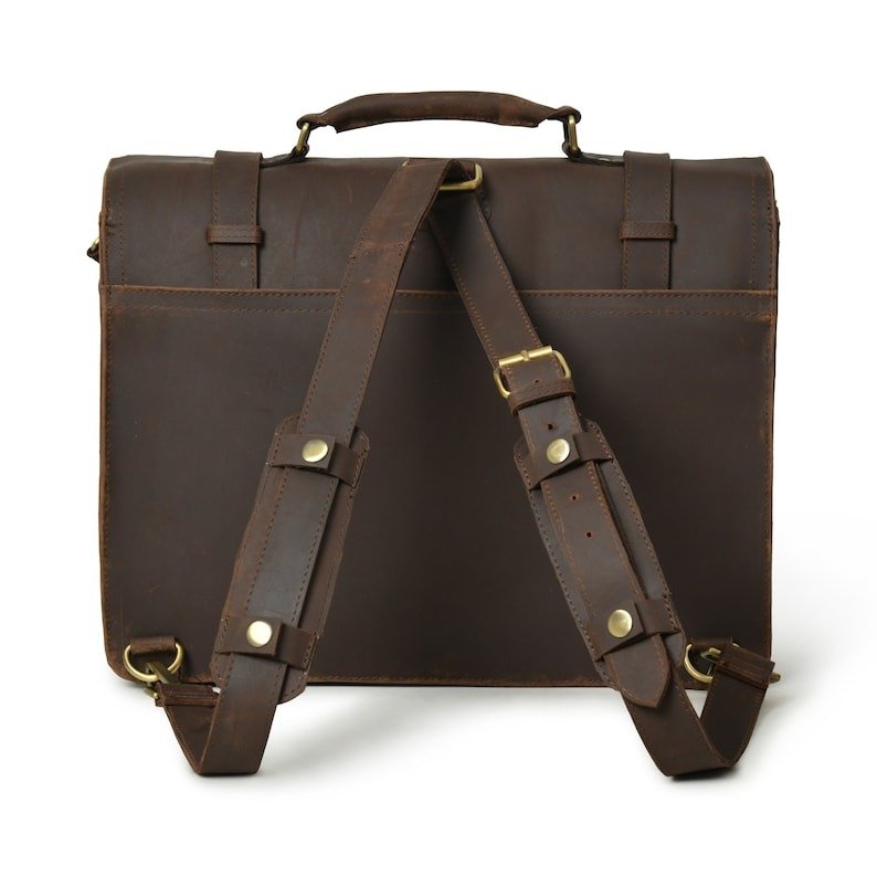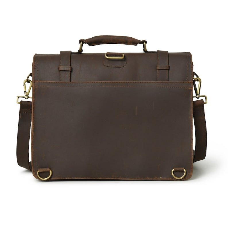 This premium full-grain leather laptop messenger bag fits up to a 15” laptop and offers ample space for notebooks, tablets, and other essentials. With a sleek design and adjustable shoulder strap, it’s perfect for business professionals or students. The bag features multiple compartments for easy organization and a secure buckle closure.