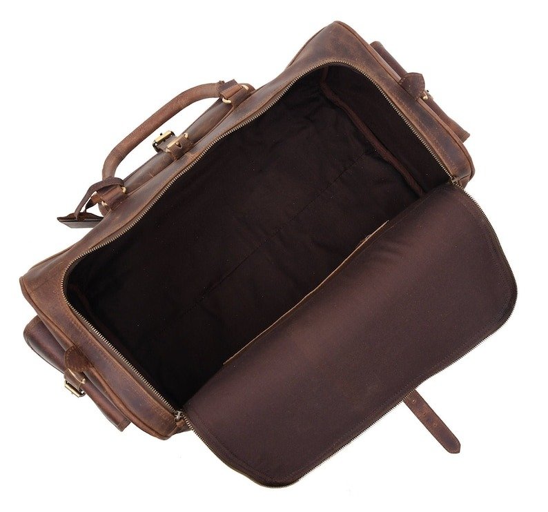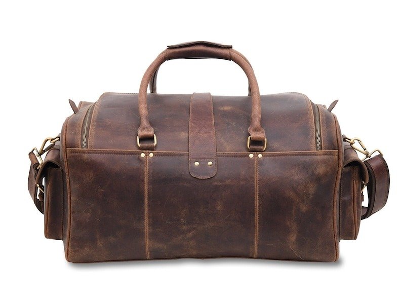- Handmade full-grain buffalo leather weekender bag.
